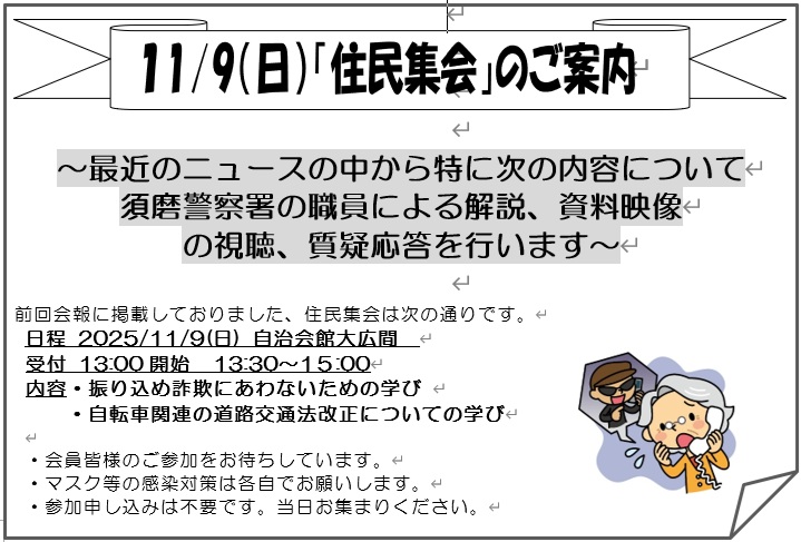申込期間:11/13~先着順 (自治会館 078-731-0410 までご連絡願います)